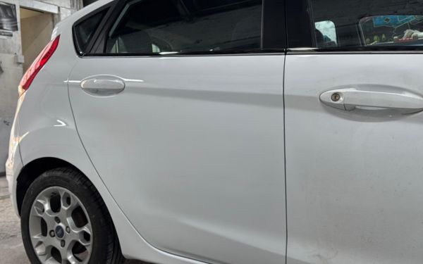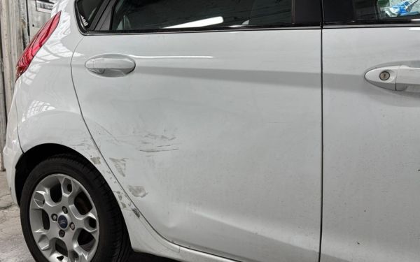 Rear door dent and paint scratches removed. Panel was reshaped and repainted to match factory finish, restoring the car’s clean look without visible flaws.