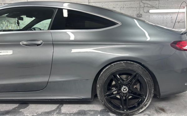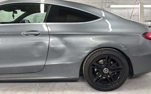 Side panel dent professionally removed and repainted. Blending and correction work returned the Mercedes to like-new condition with a smooth, high-gloss finish.